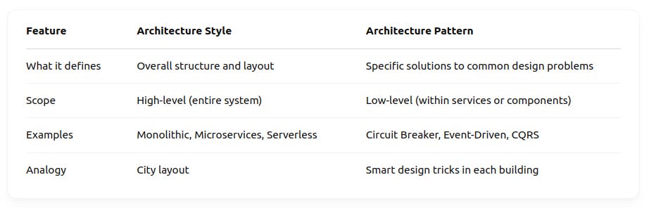Just like a city needs both a well-thought layout and smart buildings, good software needs both architecture styles and architecture patterns. Understanding this difference helps you build software that is not just functional, but also efficient and reliable.